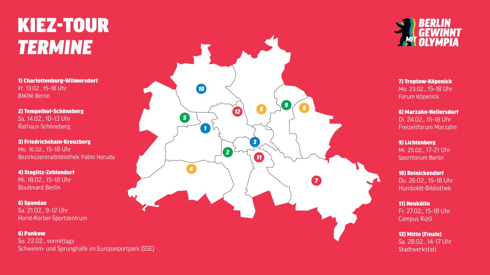 Berlinweit gehen wir mit den Menschen vor Ort ins Gespräch: Bei Sportveranstaltungen, beim Einkaufen oder an Orten der Bildung. An zwölf Stationen im Februar sammeln wir Feedback, Meinungen und Prioritäten zu den zentralen Themen der Bewerbung.